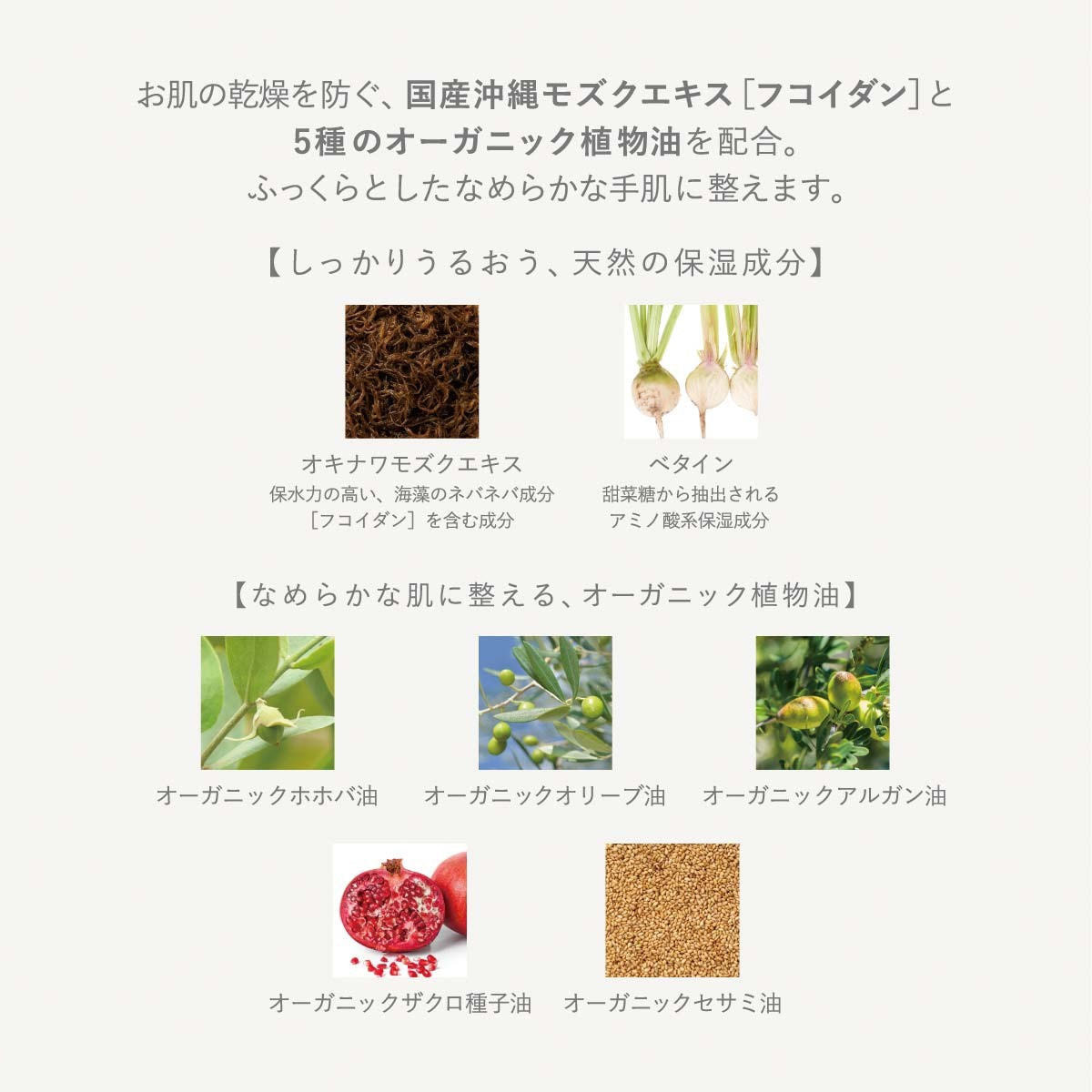 天然保湿成分オキナワモズクエキスと5種のオーガニック植物油(ホホバ油・アルガン油・オリーブ油・ザクロ種子油・セサミ油)を配合。