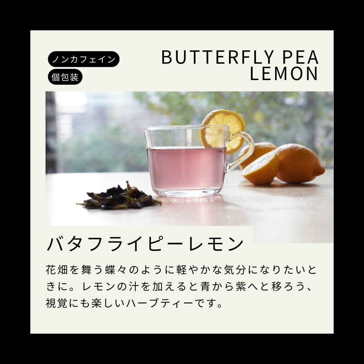 花畑を舞う蝶々のように軽やかな気分になりたいときに。レモンを加えると、青から紫へ染まってゆく色の移ろいを楽しめます。爽やかなレモンの香りとほのかな酸味。